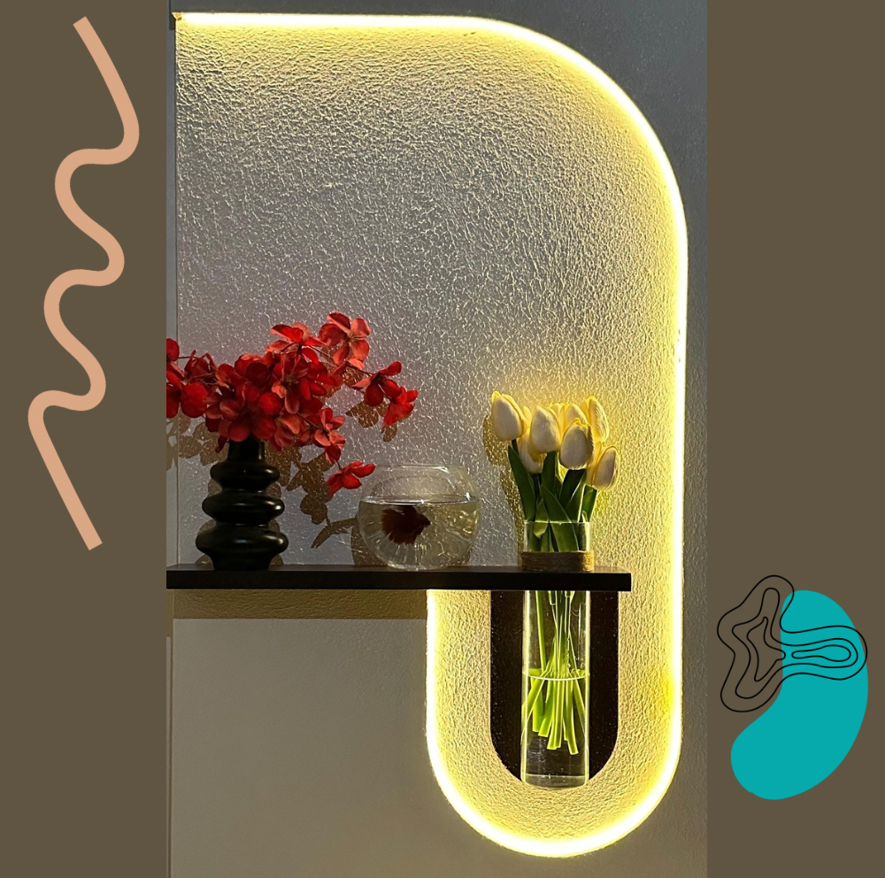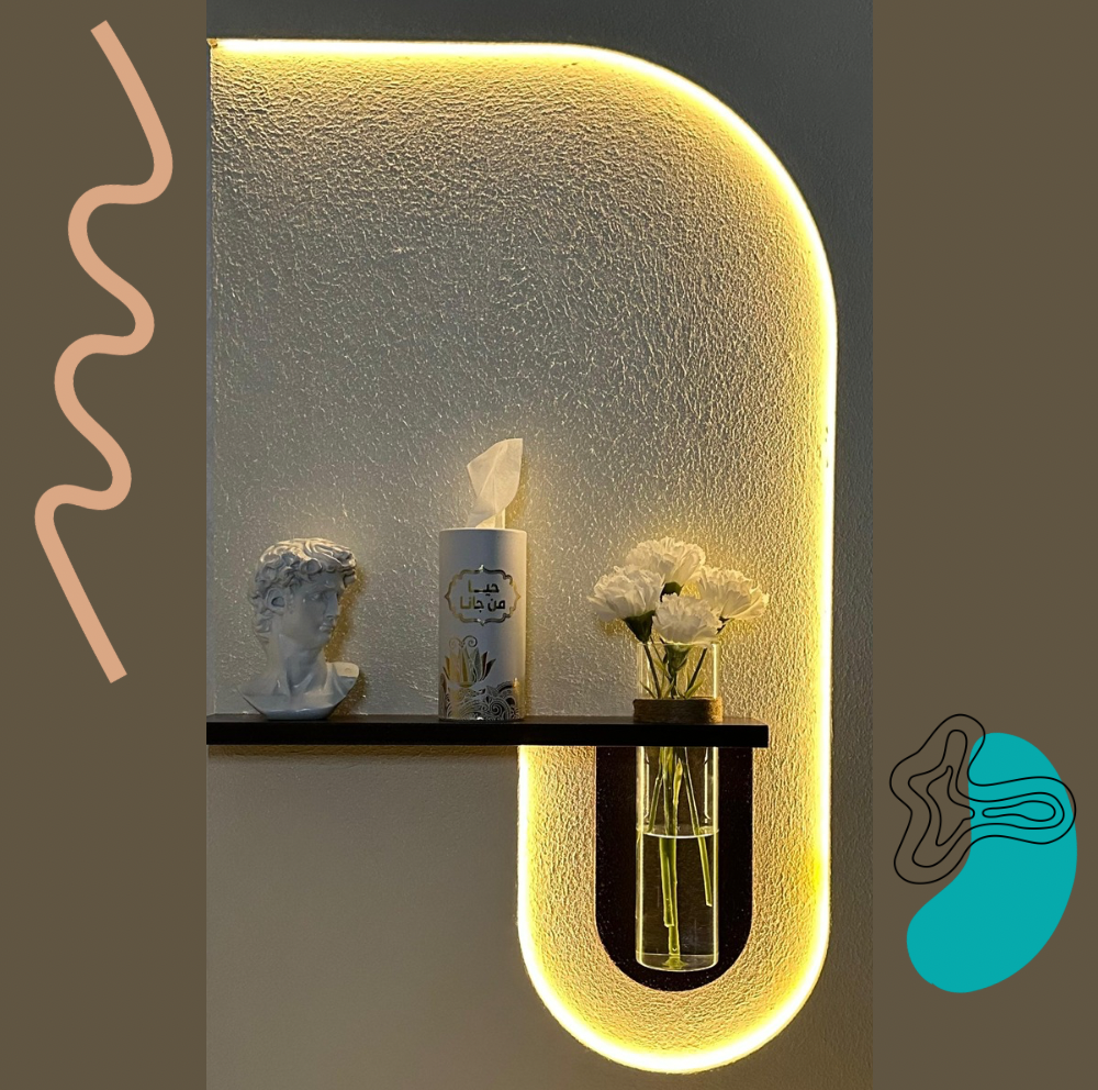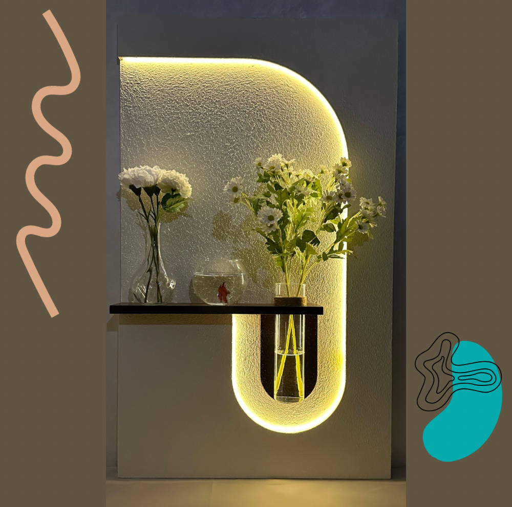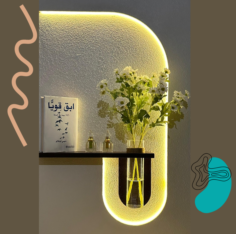 طاولة مع لوحة جدارية 3D مع ليد مضي وفازة للورد تحكم بالانارة ل 6 مستويات